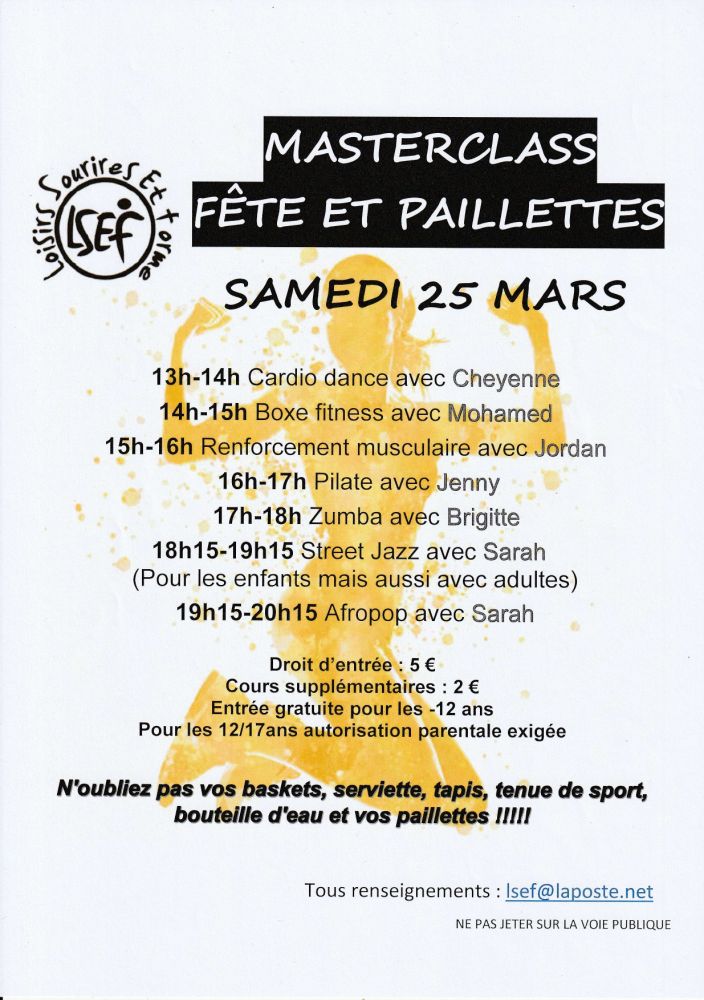 L‘association L.S.E.F.vous propose à la salle des fêtes sa Masterclass « Fête et Paillettes » le Samedi 25 mars de 13h à 20h15.