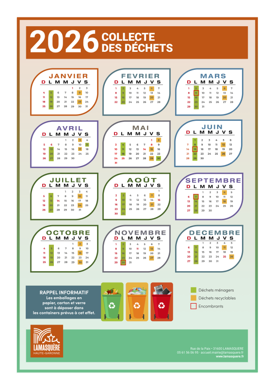 Le Muretain Agglo assurera le ramassage des encombrants sur notre commune 4 jours par an. Pour l’année 2025, les jours sont : le 06 mars, le 06 juin, le 26 septembre et le 05 décembre.